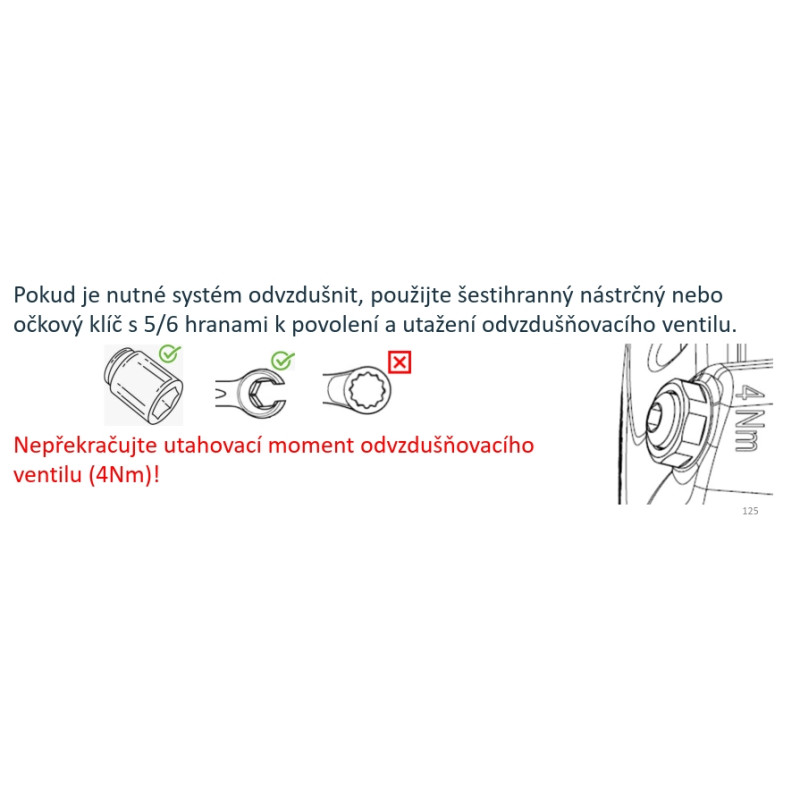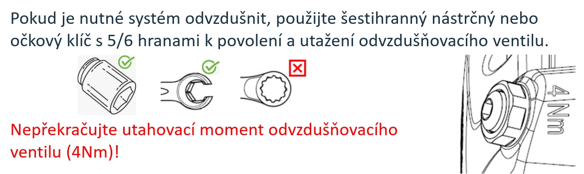 DŮLEŽITÉ UPOZORNĚNÍ: po namontování a dotažení odvzdušňovacího ventilu do těla brzdového třmenu NESMÍ být odvzdušnovací ventil demontován. Pro odvzdušnění je možné ventil povolit POUZE o 1/4 otáčky!