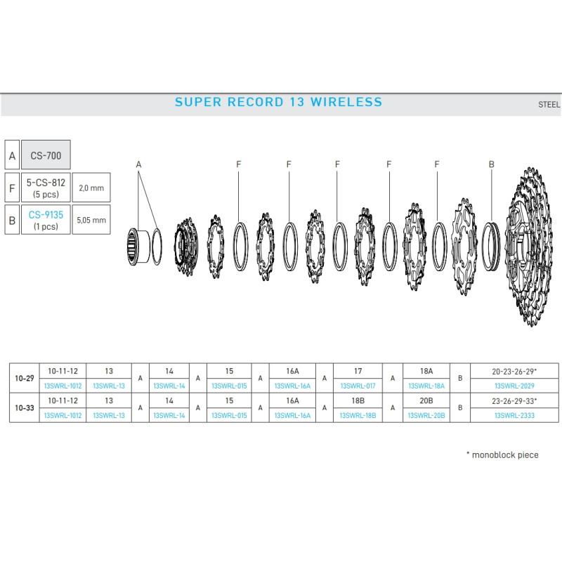 Na základě zkušeností získaných s kazetami Ekar 13s vyvinula společnost Campagnolo nové kazety pro sadu Super Record 13, navržené tak, aby zajistily plynulejší, rychlejší, přesnější a tišší řazení. Díky snížené tloušťce pastorků a optimalizovaným rozestupům se podařilo přidat jeden pastorek navíc, aniž by bylo nutné měnit standard ořechu – zachován zůstal osvědčený standard N3W, bez potřeby adaptérů nebo speciálních nábojů. Nový profil zubů v kombinaci s povrchovou úpravou Black Chrome zlepšuje tlumení hluku, odolnost proti opotřebení a dlouhodobou životnost.