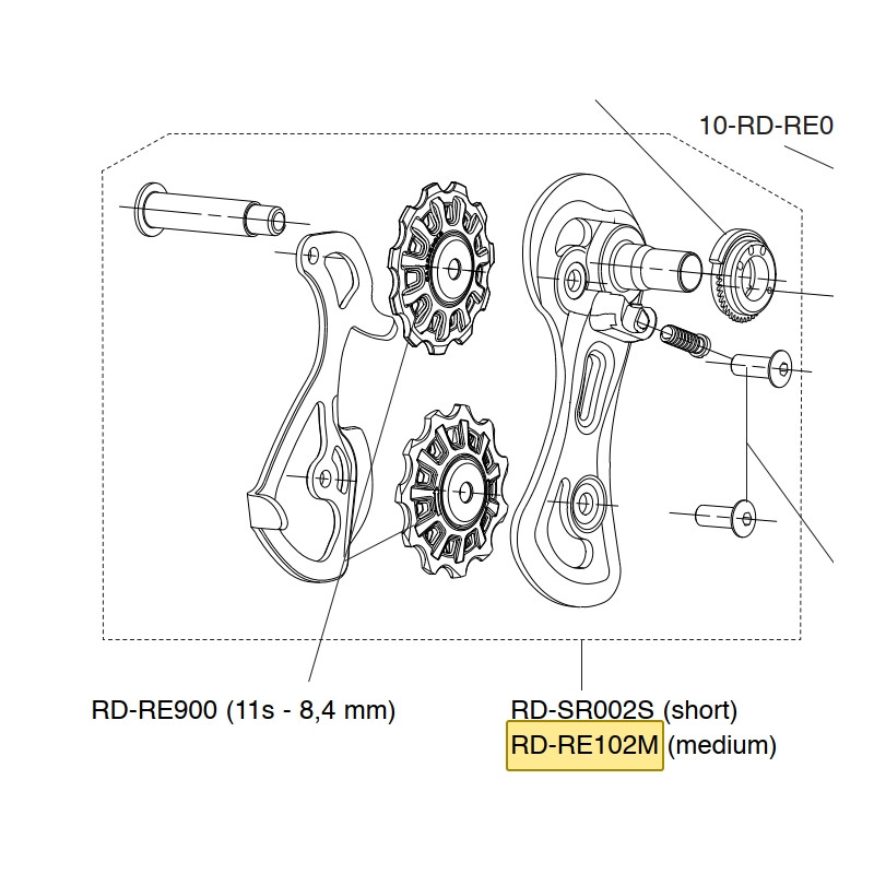 Středně dlouhé vodítko přehazovačky Potenza, které umožňuje použití kazety s nejvyšším pastorkem 32 zubů.